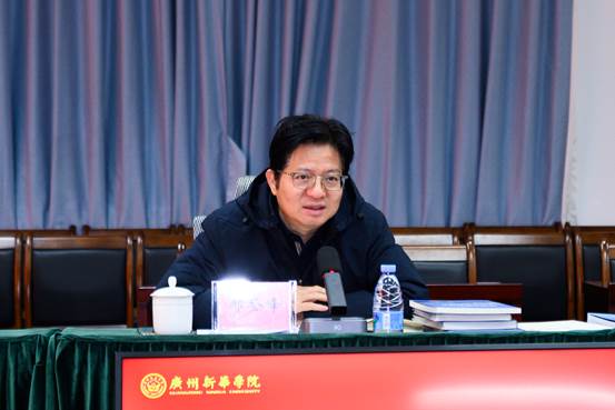 座谈会上,郝登峰在致辞中代表学校对来访嘉宾表示热烈欢迎,并详细介绍了学校的发展历程、办学特色及近年来取得的显著成就。他提到,学校自2005年由中山大学与广东东宝集团有限公司合作创办以来,始终坚持社会主义办学方向,全面贯彻党的教育方针,致力于培养高素质应用型人才。在20年的办学发展历程中,不仅传承了中山大学的优良传统和优秀学风,积淀了厚实的育人成果,更在专业设置、产教融合、校企协同的探索中走出了一条独具“新华特色”的创新之路。他强调,学校始终坚持以服务地方经济社会发展为己任,积极融入粤港澳大湾区建设大局。最后,他在致辞中特别感谢了东莞市社科联、东莞市社科院对学校发展的关心与支持,期待以此次交流为契机,进一步深化多方协作机制。