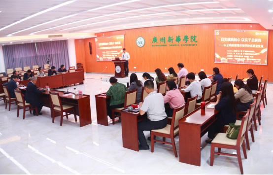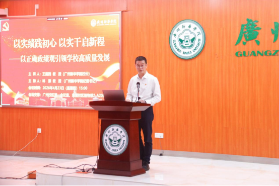 为深入贯彻党的二十大和二十届历次全会精神,认真落实四中全会部署,全面贯彻习近平总书记关于树立和践行正确政绩观的重要论述,4月23日,广州新华学院(下文简称“学校”)党委研究召开学校党委理论学习中心组(扩大)学习会暨树立和践行正确政绩观学习教育读书班辅导报告会。学校党委副书记、校长王庭槐作题为《以实绩践初心 以实干启新程——以正确政绩观引领学校高质量发展》的专题辅导报告。