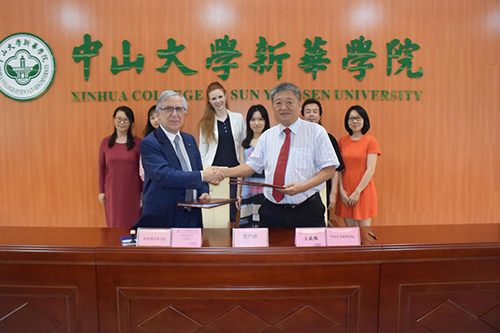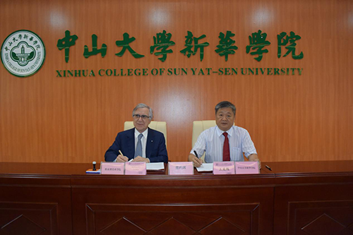 意大利维泰博美术学院Mr.Sepiacci Luigi院长(左)与中山大学新华学院王庭槐校长(右)签署合作备忘录