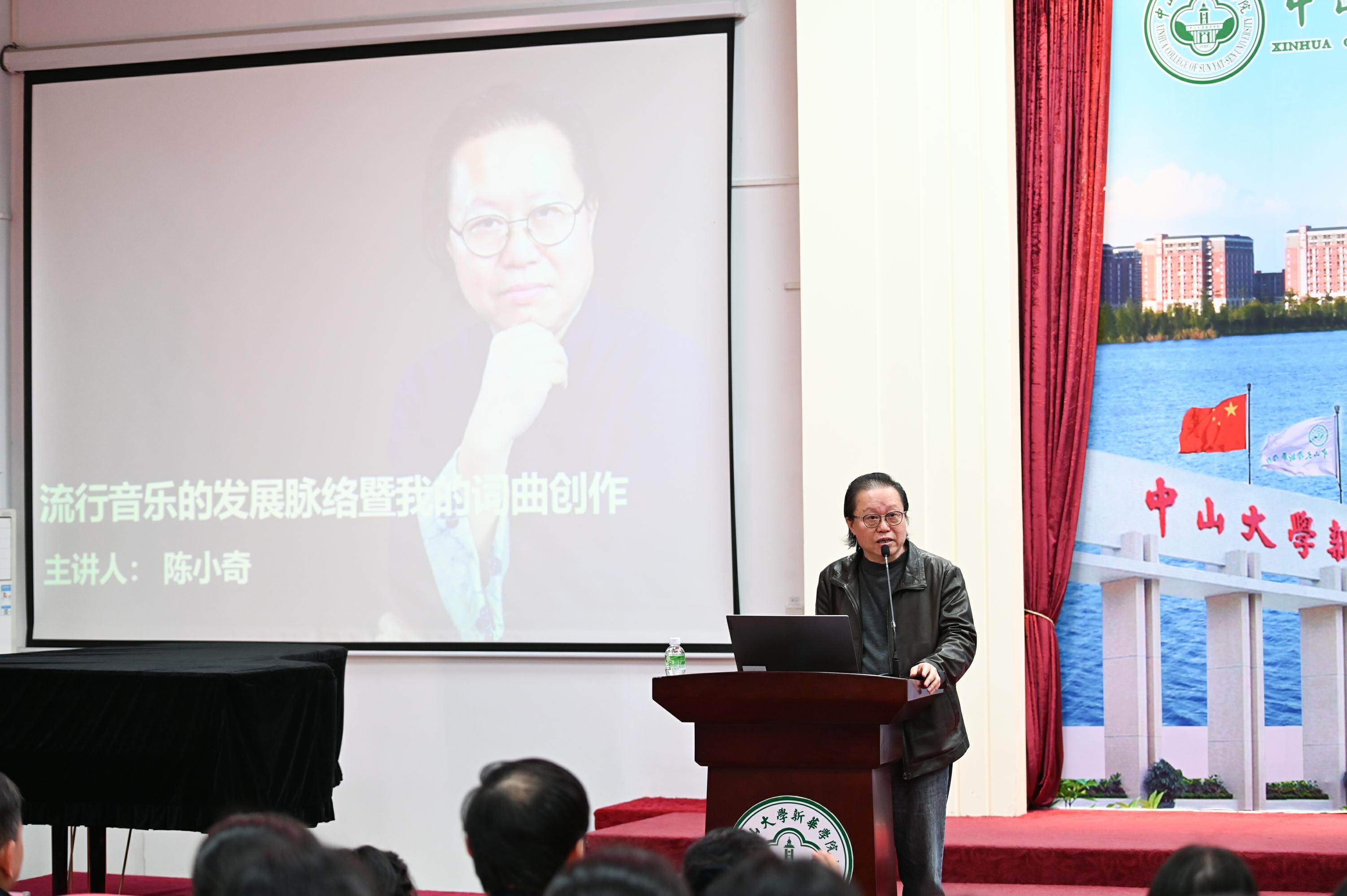 12月29日,中山大学新华学院举办“中山大学新华学院客座教授聘任仪式暨陈小奇教授学术讲座”。我国著名词曲作家、音乐制作人、文学创作一级作家陈小奇受邀为学生们做《流行音乐的发展脉络暨我的词曲创作》主题讲座,并正式受聘为该校客座教授。