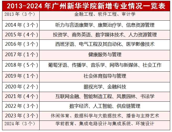 学校相关负责人介绍,广州新华学院自办学以来,在适应区域经济社会发展新形势和对接产业转型升级对复合型、应用型高素质人才需求的基础上,不断探索完善学科建设,调整专业结构,注重重点学科的培育、品牌专业的建设、特色专业的打造等根基性工作,学科专业优势日渐显现。
