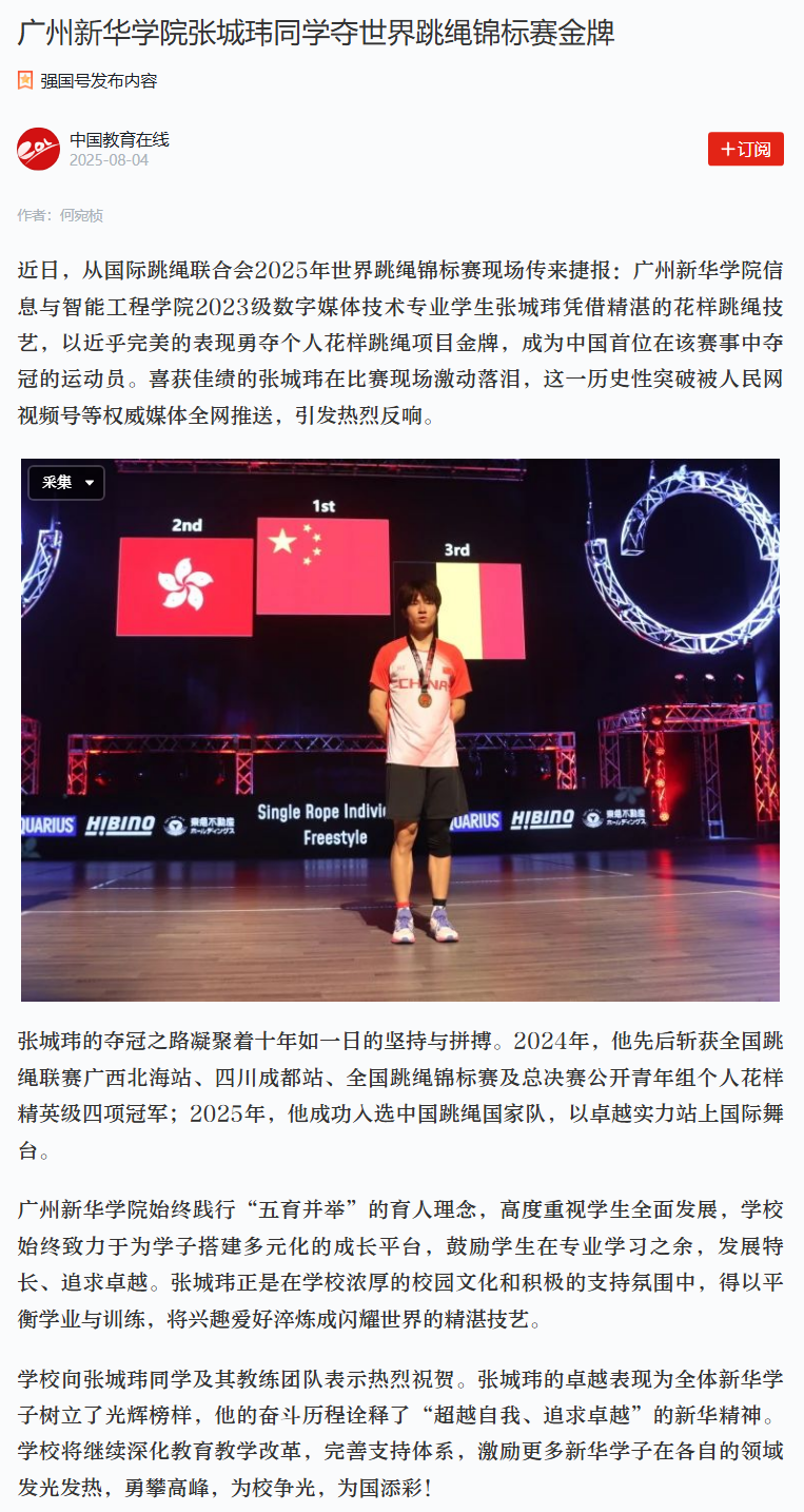 近日,从国际跳绳联合会2025年世界跳绳锦标赛现场传来捷报:广州新华学院信息与智能工程学院2023级数字媒体技术专业学生张城玮凭借精湛的花样跳绳技艺,以近乎完美的表现勇夺个人花样跳绳项目金牌,成为中国首位在该赛事中夺冠的运动员。喜获佳绩的张城玮在比赛现场激动落泪,这一历史性突破被人民网视频号等权威媒体全网推送,引发热烈反响。