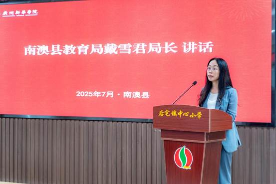南澳县教育局局长戴雪君在开班仪式上讲话。她表示,在“百千万工程”驱动下,广州新华学院以应用型人才培养服务地方发展,以“接地气”视角开展校地合作,将实践育人融入南澳县域基础教育帮扶过程,针对性开展了教育管理、思政、心理健康、劳动实践、信息技术、音乐、美术、体育、语文、数学等方向教育培训,有效促进优质资源共享,帮助海岛教师提升教学能力和科研水平。同时也借此机会,向广州新华学院办学20周年表示美好祝愿。