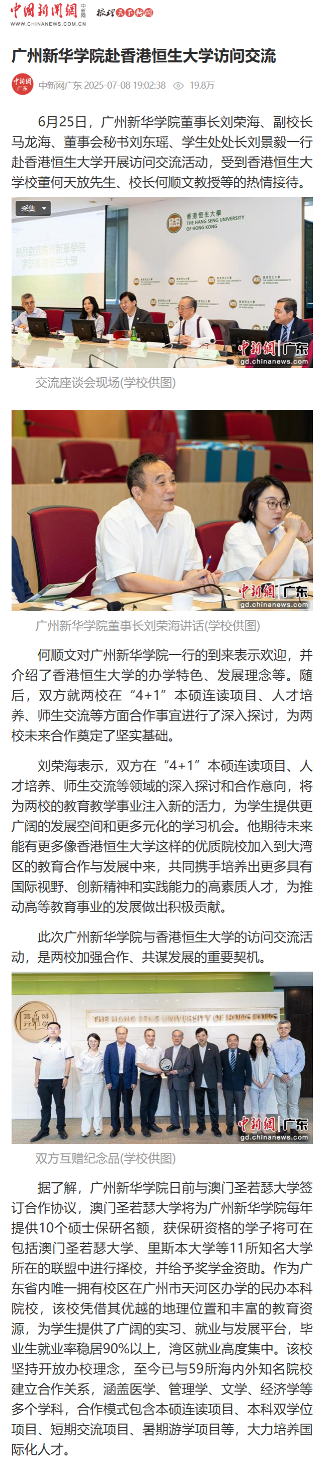 6月25日,广州新华学院董事长刘荣海、副校长马龙海、董事会秘书刘东瑶、学生处处长刘景毅一行赴香港恒生大学开展访问交流活动,受到香港恒生大学校董何天放先生、校长何顺文教授等的热情接待。