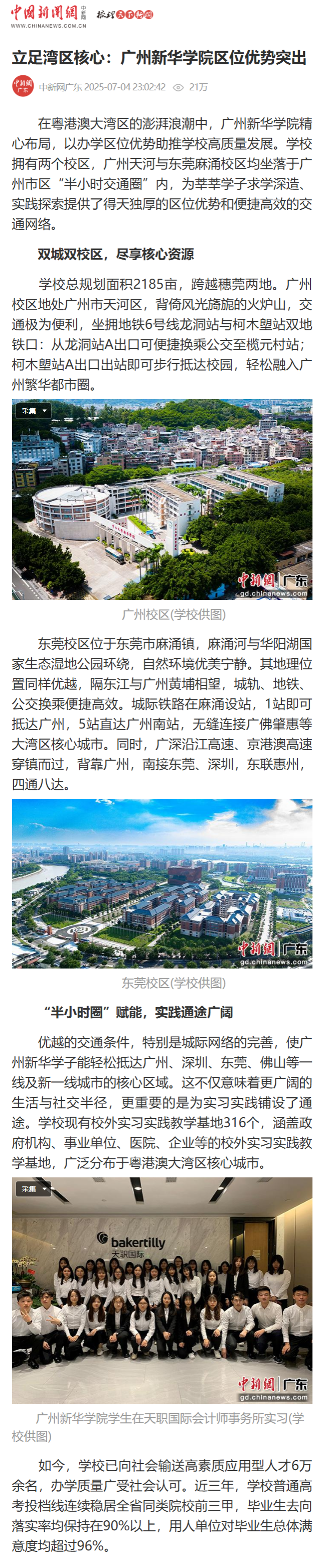在粤港澳大湾区的澎湃浪潮中,广州新华学院精心布局,以办学区位优势助推学校高质量发展。学校拥有两个校区,广州天河与东莞麻涌校区均坐落于广州市区“半小时交通圈”内,为莘莘学子求学深造、实践探索提供了得天独厚的区位优势和便捷高效的交通网络。