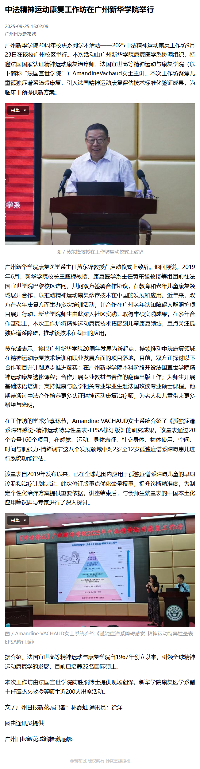 广州新华学院20周年校庆系列学术活动——2025中法精神运动康复工作坊9月23日在该校广州校区举行。本次活动由广州新华学院康复医学系协调组织,特邀法国国家认证精神运动康复治疗师、法国宜世高等精神运动与康复学院(以下简称“法国宜世学院”)AmandineVachaud女士主讲。本次工作坊聚焦儿童孤独症谱系障碍康复,引入法国精神运动康复评估技术标准化验证成果,为临床干预提供新方案。