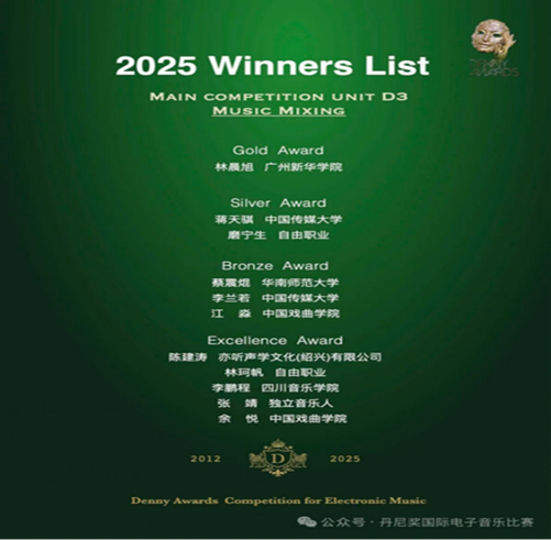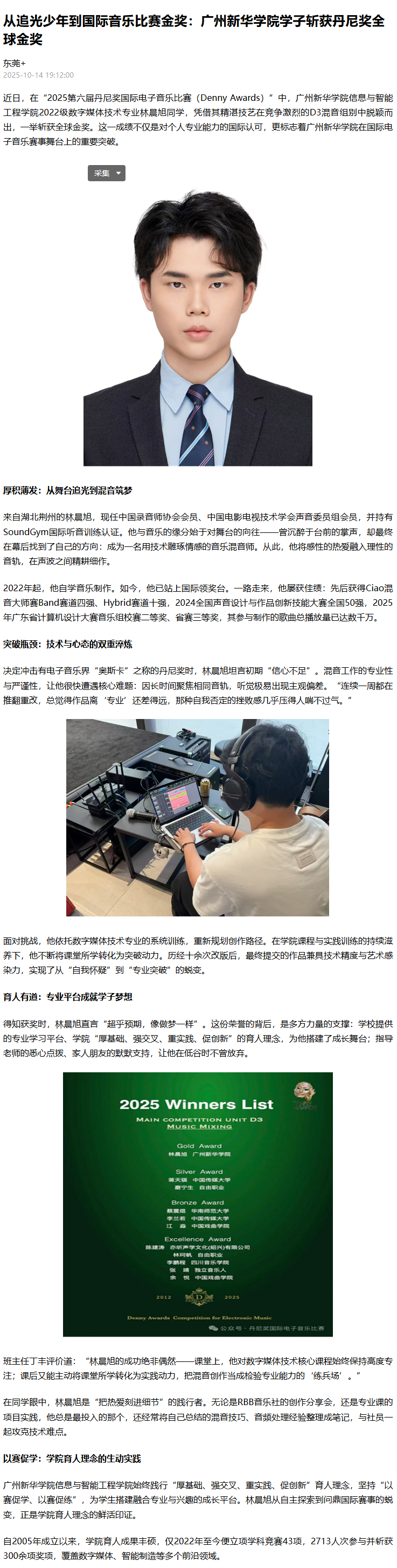 近日,在“2025第六届丹尼奖国际电子音乐比赛(Denny Awards)”中,广州新华学院信息与智能工程学院2022级数字媒体技术专业林晨旭同学,凭借其精湛技艺在竞争激烈的D3混音组别中脱颖而出,一举斩获全球金奖。这一成绩不仅是对个人专业能力的国际认可,更标志着广州新华学院在国际电子音乐赛事舞台上的重要突破。