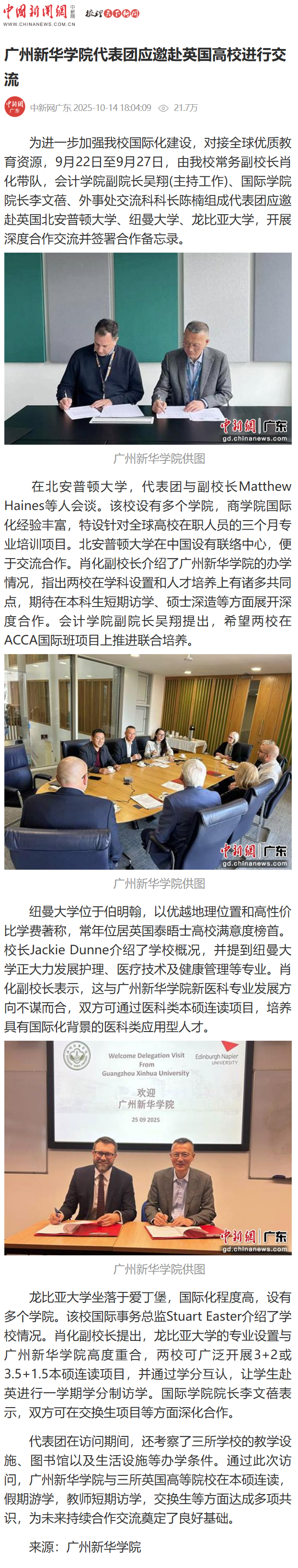 为进一步加强我校国际化建设,对接全球优质教育资源,9月22日至9月27日,由我校常务副校长肖化带队,会计学院副院长吴翔(主持工作)、国际学院院长李文蓓、外事处交流科科长陈楠组成代表团应邀赴英国北安普顿大学、纽曼大学、龙比亚大学,开展深度合作交流并签署合作备忘录。