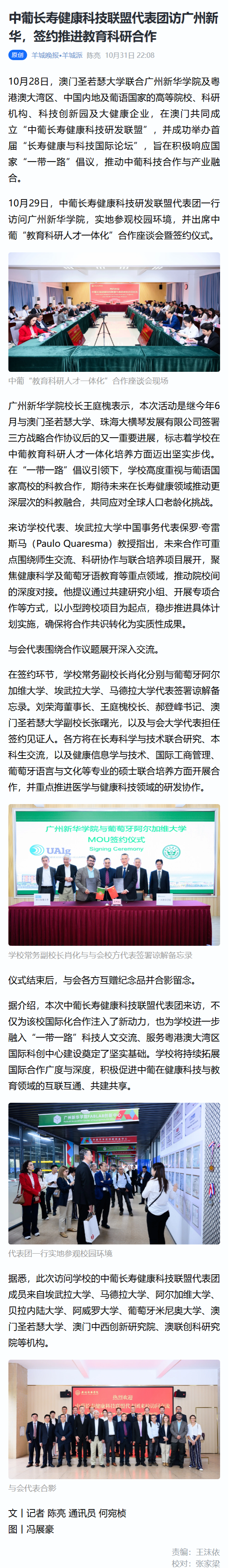 广州新华学院校长王庭槐表示,本次活动是继今年6月与澳门圣若瑟大学、珠海大横琴发展有限公司签署三方战略合作协议后的又一重要进展,标志着学校在中葡教育科研人才一体化培养方面迈出坚实步伐。在“一带一路”倡议引领下,学校高度重视与葡语国家高校的科教合作,期待未来在长寿健康领域推动更深层次的科教融合,共同应对全球人口老龄化挑战。