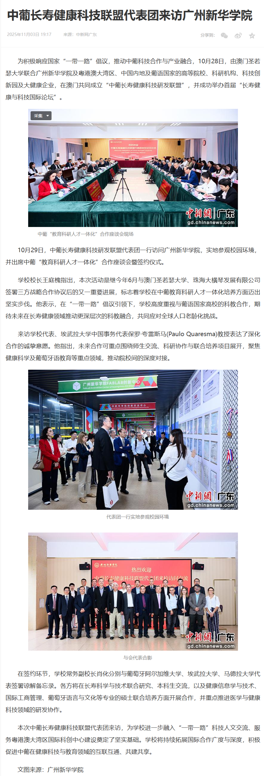 10月29日,中葡长寿健康科技研发联盟代表团一行访问广州新华学院,实地参观校园环境,并出席中葡“教育科研人才一体化”合作座谈会暨签约仪式。