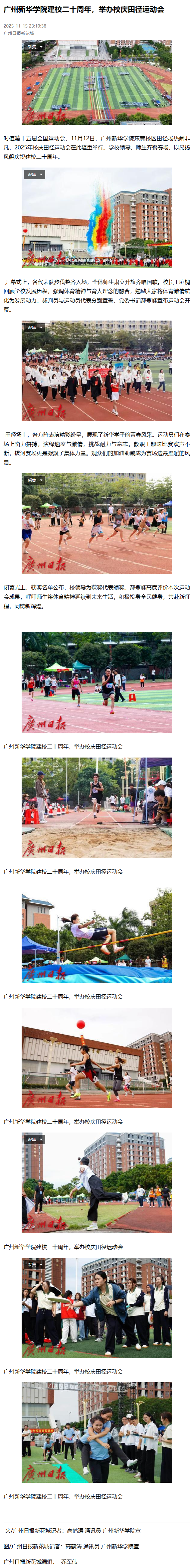 时值第十五届全国运动会,11月12日,广州新华学院东莞校区田径场热闹非凡,2025年校庆田径运动会在此隆重举行。学校领导、师生齐聚赛场,以昂扬风貌庆祝建校二十周年。