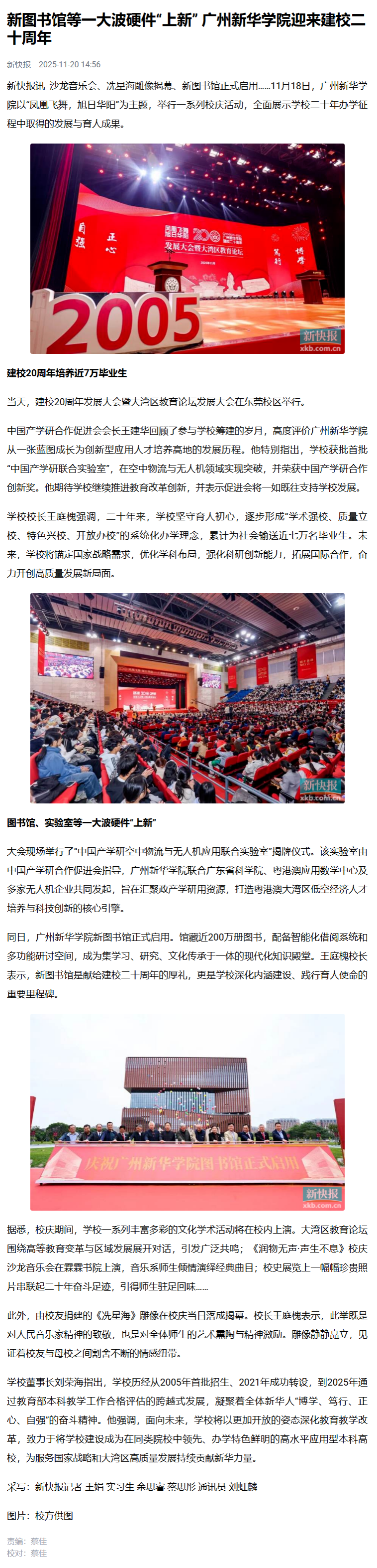 新快报讯 沙龙音乐会、冼星海雕像揭幕、新图书馆正式启用……11月18日,广州新华学院以“凤凰飞舞,旭日华阳”为主题,举行一系列校庆活动,全面展示学校二十年办学征程中取得的发展与育人成果。