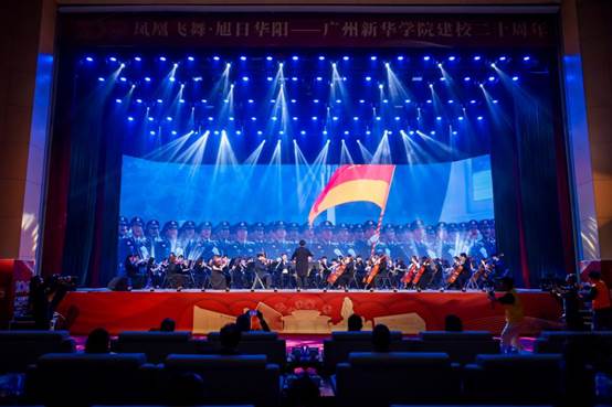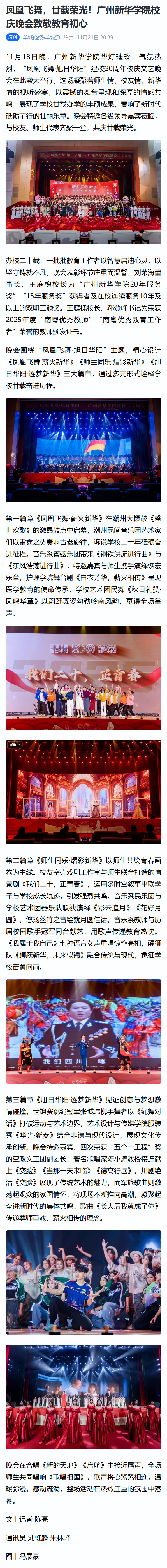 11月18日晚,广州新华学院华灯璀璨,气氛热烈,“凤凰飞舞·旭日华阳”建校20周年校庆文艺晚会在此盛大举行。这场凝聚着师生情、校友情、新华情的视听盛宴,以震撼的舞台呈现和深厚的情感共鸣,展现了学校廿载办学的丰硕成果,奏响了新时代砥砺前行的壮丽乐章。晚会特邀各级领导嘉宾莅临,与校友、师生代表齐聚一堂,共庆廿载荣光。