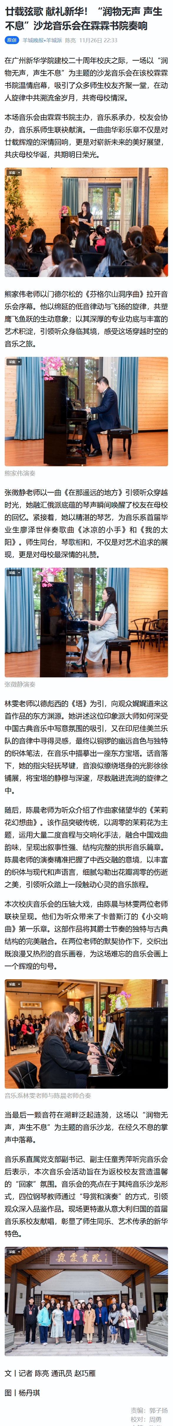 在广州新华学院建校二十周年校庆之际,一场以“润物无声,声生不息”为主题的沙龙音乐会在该校霖霖书院温情启幕,吸引了众多师生校友齐聚一堂,在动人旋律中共溯流金岁月,共寄母校情深。