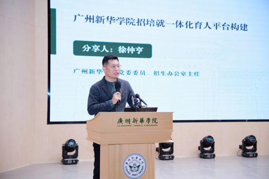 广州新华学院党委委员、招生办公室主任徐仲亨围绕“广州新华学院招培就一体化育人平台的构建”作主题分享。他向参会嘉宾系统介绍了近年招生录取情况、学校人才培养特色及人才培养成效。他表示,学校坚持以“招—培—就”深度联动为核心纽带,紧密围绕“立足湾区、服务广东、辐射全国”的服务定位及“德才兼备、知行合一”高素质应用型人才培养目标,在传承特色育人经验的同时,构建起了全链条协调育人体系,以优异的育人答卷向同类领先的一流应用型高校目标坚实迈进。