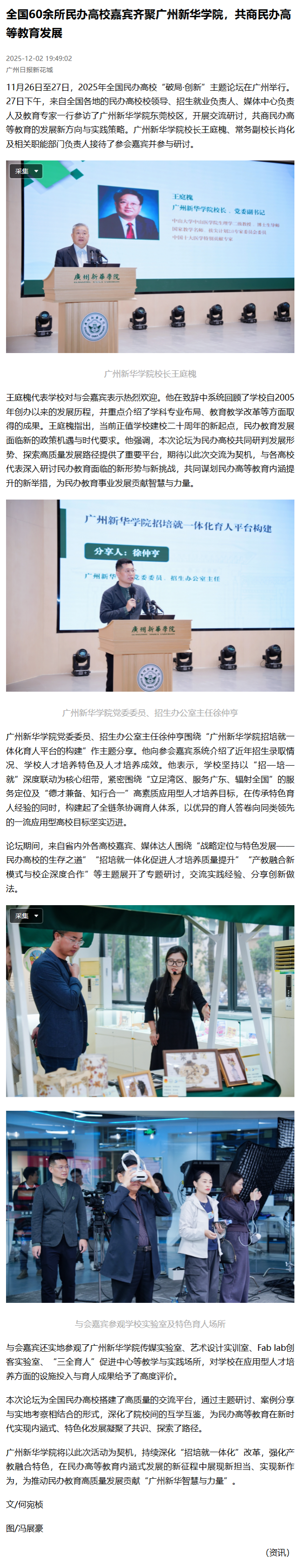 11月26日至27日,2025年全国民办高校“破局·创新”主题论坛在广州举行。27日下午,来自全国各地的民办高校校领导、招生就业负责人、媒体中心负责人及教育专家一行参访了广州新华学院东莞校区,开展交流研讨,共商民办高等教育的发展新方向与实践策略。广州新华学院校长王庭槐、常务副校长肖化及相关职能部门负责人接待了参会嘉宾并参与研讨。