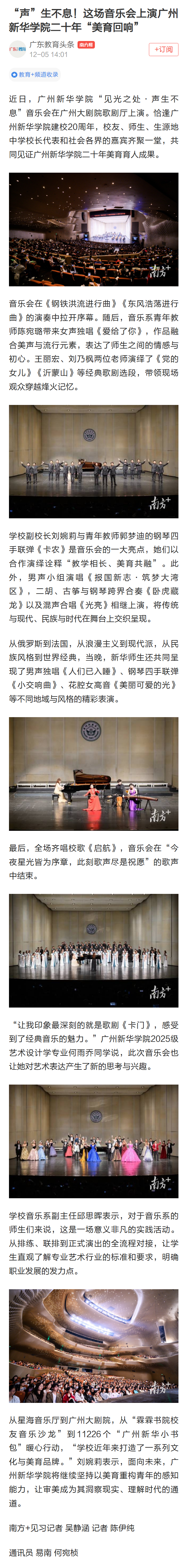 从星海音乐厅到广州大剧院,从“霖霖书院校友音乐沙龙”到11226个“广州新华小书包”暖心行动,“学校近年来打造了一系列文化与美育品牌。”刘婉莉表示,面向未来,广州新华学院将继续坚持以美育重构青年的感知能力,让审美成为其洞察现实、理解时代的通道。