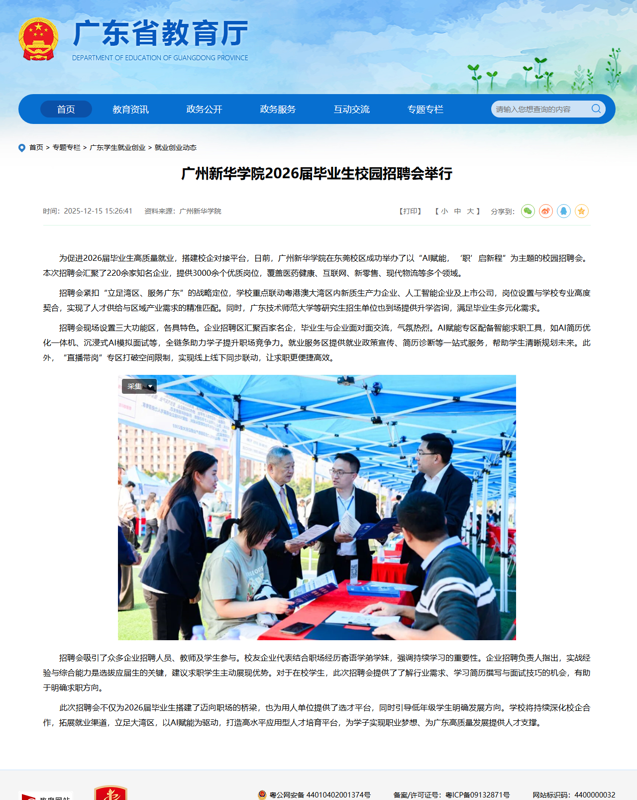 为促进2026届毕业生高质量就业,搭建校企对接平台,日前,广州新华学院在东莞校区成功举办了以“AI赋能,‘职’启新程”为主题的校园招聘会。本次招聘会汇聚了220余家知名企业,提供3000余个优质岗位,覆盖医药健康、互联网、新零售、现代物流等多个领域。