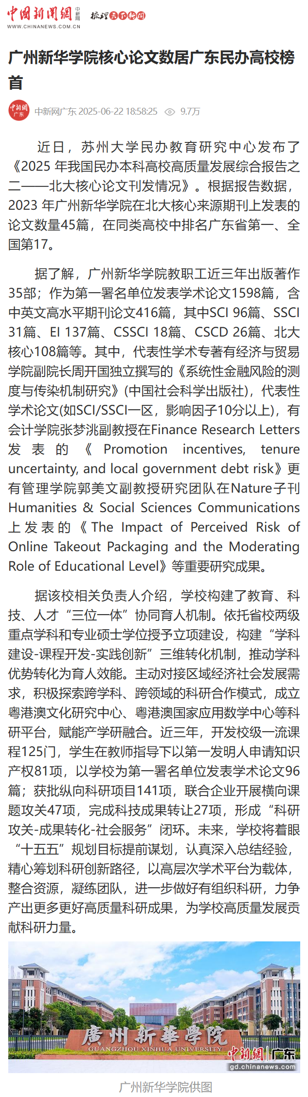 据了解,广州新华学院教职工近三年出版著作35部;作为第一署名单位发表学术论文1598篇,含中英文高水平期刊论文416篇,其中SCI 96篇、SSCI 31篇、EI 137篇、CSSCI 18篇、CSCD 26篇、北大核心108篇等。其中,代表性学术专著有经济与贸易学院副院长周开国独立撰写的《系统性金融风险的测度与传染机制研究》(中国社会科学出版社),代表性学术论文(如SCI/SSCI一区,影响因子10分以上),有会计学院张梦洮副教授在Finance Research Letters发表的《Promotion incentives, tenure uncertainty, and local government debt risk》更有管理学院郭美文副教授研究团队在Nature子刊Humanities & Social Sciences Communications上发表的《The Impact of Perceived Risk of Online Takeout Packaging and the Moderating Role of Educational Level》等重要研究成果。