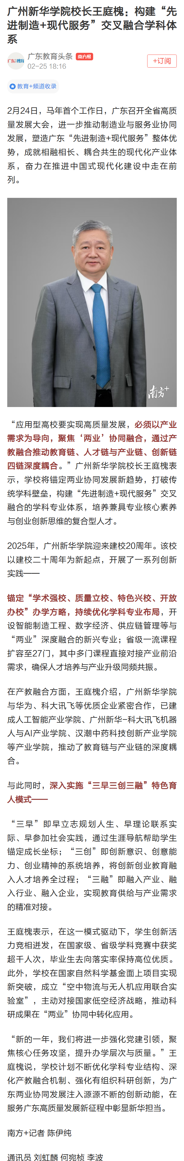 在产教融合方面,王庭槐介绍,广州新华学院与华为、科大讯飞等优质企业紧密合作,已建成人工智能产业学院、广州新华-科大讯飞机器人与AI产业学院、汉潮中药科技创新产业学院等产业学院,推动了教育链与产业链的深度耦合。