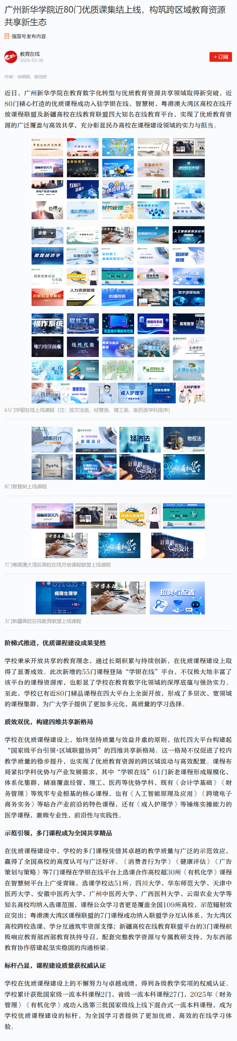 近日,广州新华学院在教育数字化转型与优质教育资源共享领域取得新突破,近80门精心打造的优质课程成功入驻学银在线、智慧树、粤港澳大湾区高校在线开放课程联盟及新疆高校在线教育联盟四大知名在线教育平台,实现了优质教育资源的广泛覆盖与高效共享,充分彰显民办高校在课程建设领域的实力与担当。