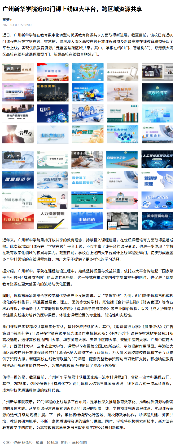 广州新华学院表示,79门课程的上线与多平台布局,是学校深入推进教育数字化、推动优质资源均衡发展的具体实践。从早期课程建设积累到近期55门课程的新增上线,学校持续完善课程体系,实现课程资源的迭代升级与规模扩展。下一步,学校将继续深化跨区域、跨校际教学协作,以课程共建、师资共培、教研共研为抓手,不断丰富优质课程资源的储备与供给。同时,学校将积极探索新技术、新方法在教育教学中的应用,为高等教育高质量发展贡献更多实践经验与创新成果。