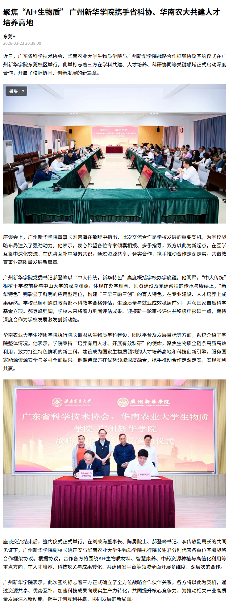 近日,广东省科学技术协会、华南农业大学生物质学院与广州新华学院战略合作框架协议签约仪式在广州新华学院东莞校区举行。此举标志着三方在学科共建、人才培养、科研协同等关键领域正式启动深度合作,开启了校际协同、创新发展的新篇章。