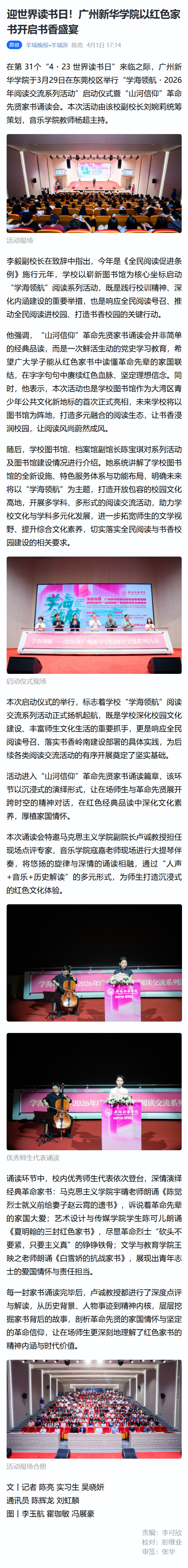 在第31个“4・23世界读书日”来临之际,广州新华学院于3月29日在东莞校区举行“学海领航・2026年阅读交流系列活动”启动仪式暨“山河信仰”革命先贤家书诵读会。本次活动由该校副校长刘婉莉统筹策划,音乐学院教师杨超主持。