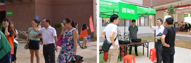 蓝永金副院长副书记、杨卫华副院长巡查完新生宿舍、缴费点、校园卡点、新食堂后,再次来到各系迎新准备现场,询问迎新志愿者的工作开展情况,与各系新生报到处工作人员交谈,就存在的问题提出意见和解决办法,力保迎新工作的顺利进行。