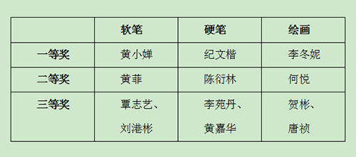 经过选手们一小时的用心创作,一幅幅优美的作品展现在了评委们的面前。评委老师们仔细的欣赏后,对作品进行了细致点评,并评选出了本次比赛的一二三等奖。获奖名单如下: