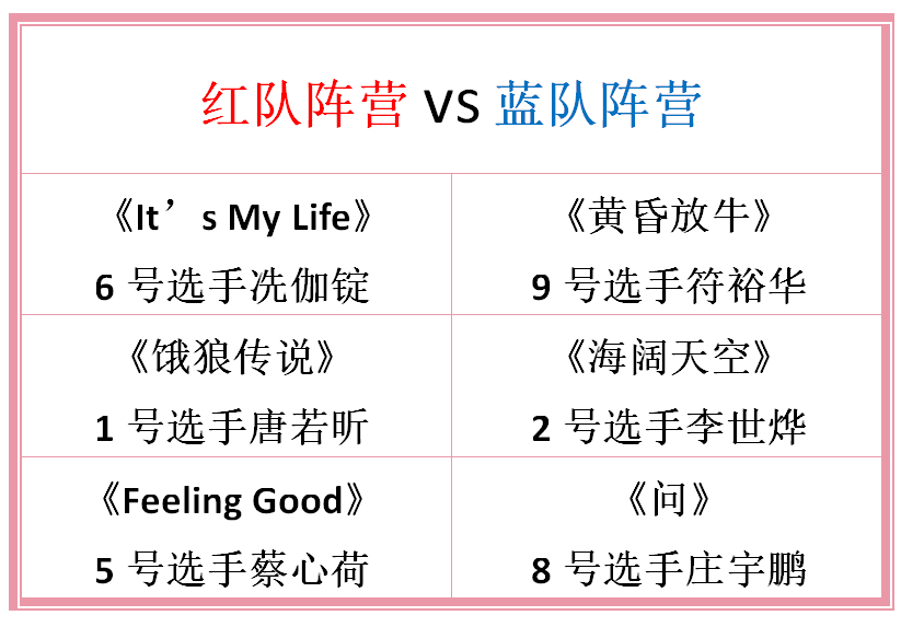 本场决赛共分为三轮。第一轮比赛为“盖世英雄”,本环节的10名选手分为五个小组,分别以“木、灯塔、水、火、金”为主题词,进行合作演唱。