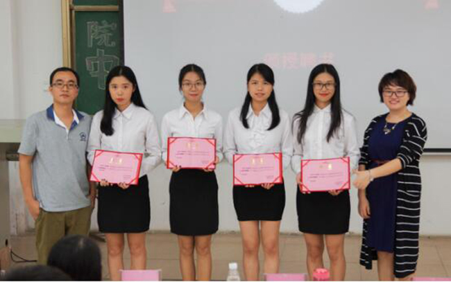 杨帮琰副主任(左一)、刘英老师(右一)为学生记者代表颁授聘书