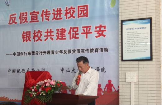 随后,中国银行东莞分行钟国军副行长讲话。他再次强调了本次活动的重要意义,希望同学们通过此次活动,提高防假、反假、识假的意识和能力,为维护金融环境的和谐稳定贡献力量。