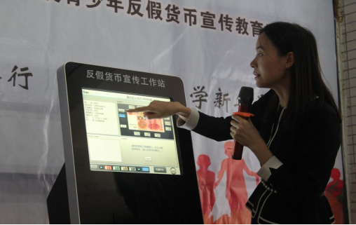 广州市银科电子有限公司刘女士向同学们详细讲解了“反假货币宣传工作站”机具的功能和使用技巧。该机具有识别假币、统计报表文字等功能。