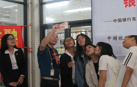 刘女士还在现场用机具对货币进行真假检验演示,让同学们更直观地了解机具的使用方法。主持人邀请了同学们上台进行实物货币真伪辨别的互动,同学积极参与,上了一堂生动地“金融反假课”。