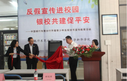 接着,中国银行东莞分行钟国军副行长和运营部何坚主任与我校保卫处罗立和副处长和图书馆钟伟珍副馆长一同进行了“反假货币宣传工作站”机具揭幕仪式。