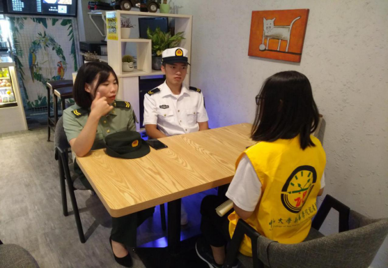 退役军人杨钰琳(左一)、吴豪贤(左二)在与学生记者交谈(图中采访时间为2019年)