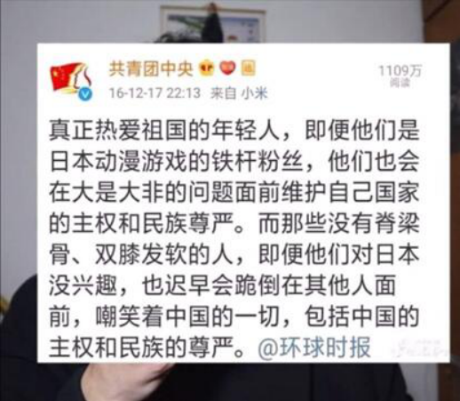 关于社会上一直颇有争议的围绕日本“宅文化”的问题讨论,他以共青团中央于16年援引《环球时报》的一段话来做出了“最权威”的诠释——“真正热爱祖国的年轻人,他们即使是日本动漫游戏的铁杆粉丝,也还是会在大是大非的问题面前维护自己国家的主权与民族尊严的。而那些没有脊梁骨,双膝发软的人,即便他们对日本没兴趣,也迟早会跪倒在其他人面前,嘲笑着中国的一切,包括中国的主权与民族尊严。”