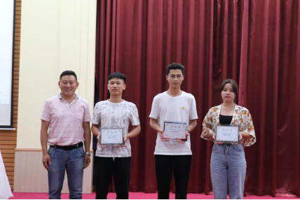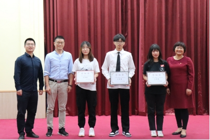 校团委书记代亮(左一)、会计学院执行院长林源(左二)和学院党总支书记李安兰(右一)颁发会计学院“班级风采大赛”三等奖荣誉证书