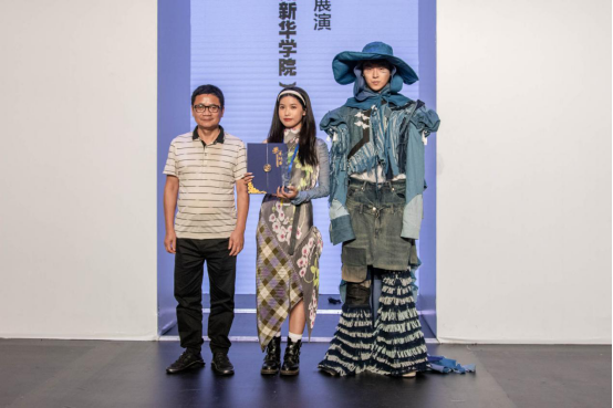 广东省服装服饰行业协会执行副会长周仑(左一)为获得二等奖的设计师罗逸瑶颁奖