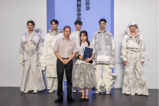 珠海市奥伦提时装有限公司董事长谢昭裕(左一)为获得三等奖的设计师施薏颁奖