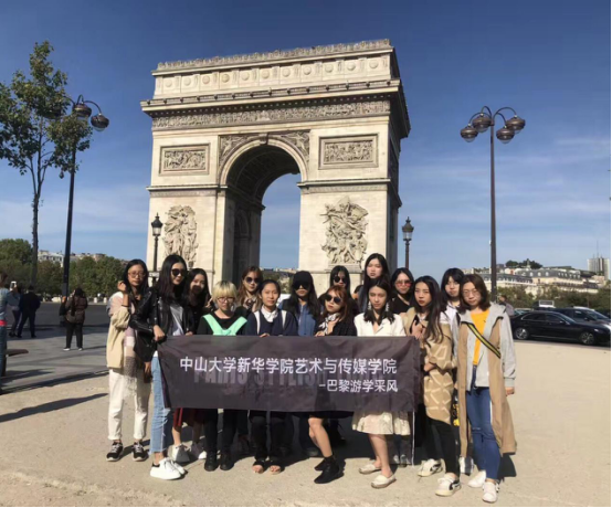 中大新华艺术设计与传媒学院师生一行人到达巴黎并在巴黎凯旋门合影