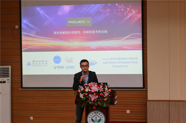 广东外语外贸大学教授、博士生导师、英语语言文化学院院长温宾利教授及美国、Worldviz中国区教育事业部总裁、对外经济贸易大学英语学院实践导师陈东先生作主旨演讲