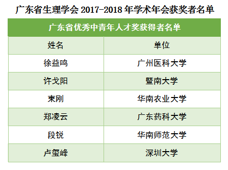 为表彰我省生理学家对学科教学、科学研究所做出的贡献,进一步鼓励和支持生理学领域中青年科研教学人才的成长。大会在学术报告环节后举行了2018年度“广东省优秀中青年人才奖”、“广东省生理学会教育教学奖”、“广东省生理学会青年优秀论文奖”颁奖仪式。