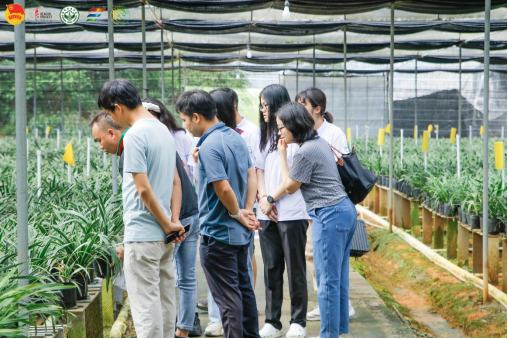 在重阳水口兰花种植基地,实践队队员们见到了大片的兰花棚。棚区内一排排的兰花苗向远处延伸,满目尽是一眼望不到头的翠绿色。基地负责人侯先生带领实践队参观了大片的兰花种植棚,并详细介绍了兰花的各个品种。侯先生表示,这里的兰花主要运往广州进行批发销售,或是运至福建在电商平台上进行零售。红草、中国龙、西施、梦香,都是比较受欢迎的兰花品种。