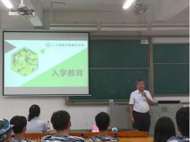 我校校长王庭槐,我校副校长、人工智能与数据科学系学科带头人姚正安,督学刘东远等校领导,特邀专家教授熊健,相关学系老师以及全体人工智能专业新生参加会议。