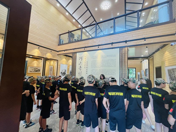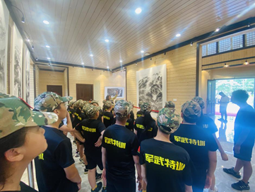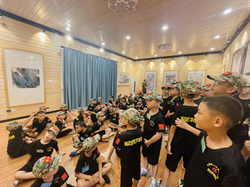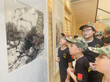 盛夏八月,烈日炎炎,广州新华学院(以下简称“学校”)联合广东省人民政府文史研究馆和广东省许钦松艺术基金会共同举办的“何止青绿——岭南当代名家山水画毕业季精品特展”如火如荼进行中。8月7日,学校霖霖书院迎来了一抹特别的绿色——塔山军武道军事夏令营的“小小兵”,他们被霖霖书院展出的名家山水画深深吸引,专程前来参观。