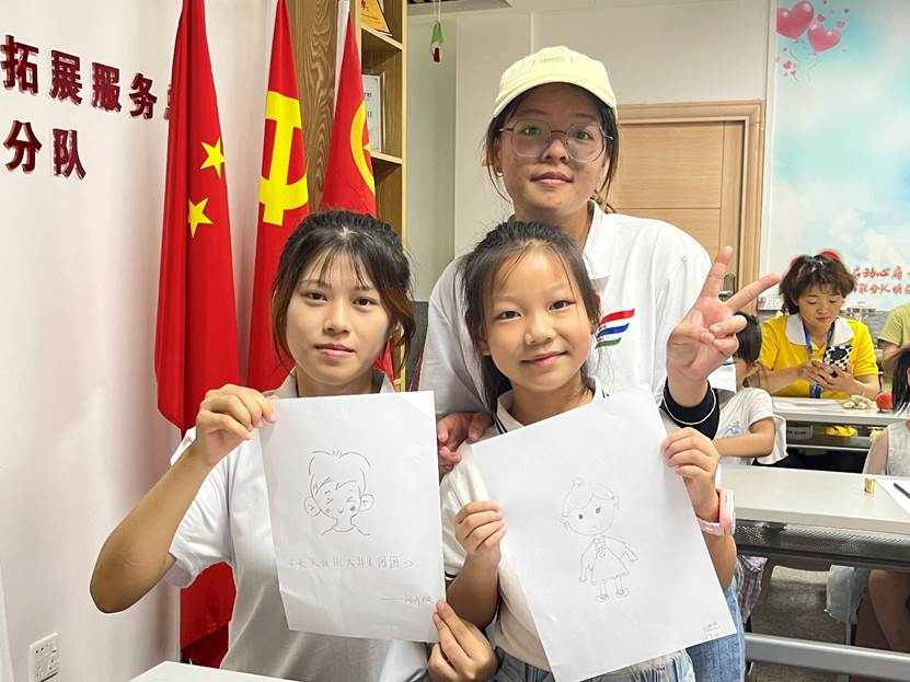 实践队成员与随迁子女共同展示自画像