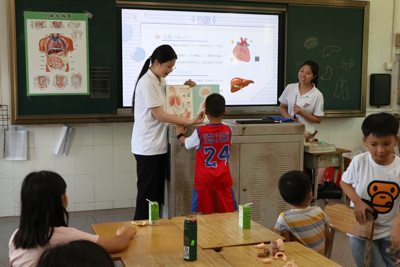 实践队在三天的课程中,为小朋友们讲解了很多医学知识,如血液循环、运动前的热身、如何预防烫伤、眼部结构及功能、新冠和甲流的预防、吸烟与毒品的危害、颈椎病的预防措施,消防知识、溺水和触电急救知识等。孩子们认真听讲,主动参与,积极互动,形成了良好的课堂氛围。