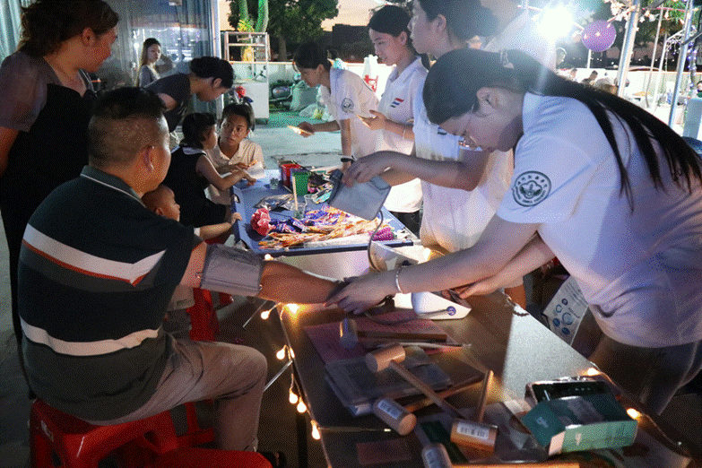 实践队来到板芙镇青年创业集市进行摆摊宣传,积极发动当地居民参加次日在板芙小学举行的医学趣味课堂。队员们分工明确,有条不紊地为居民们量血压、进行耳穴压豆等简单的义诊,与前来摊位的居民和小朋友们进行夹弹珠、垃圾分类等游戏互动,在义诊和游戏的同时对居民们进行课程宣传。
